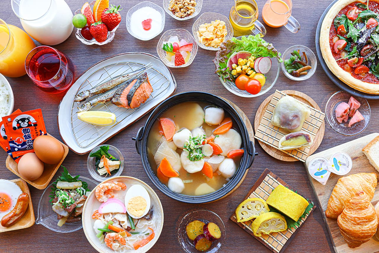 館内には、旅の疲れをそっと癒す大浴場&サウナをご用意。長期滞在でも「住む」ように過ごせる機能性と心地よさを備え、忙しいビジネスの合間にも安らぎの時間をお届けします。 朝食ビュッフェでは、熊本や阿蘇の恵みを取り入れたメニューが1日の活力に。
