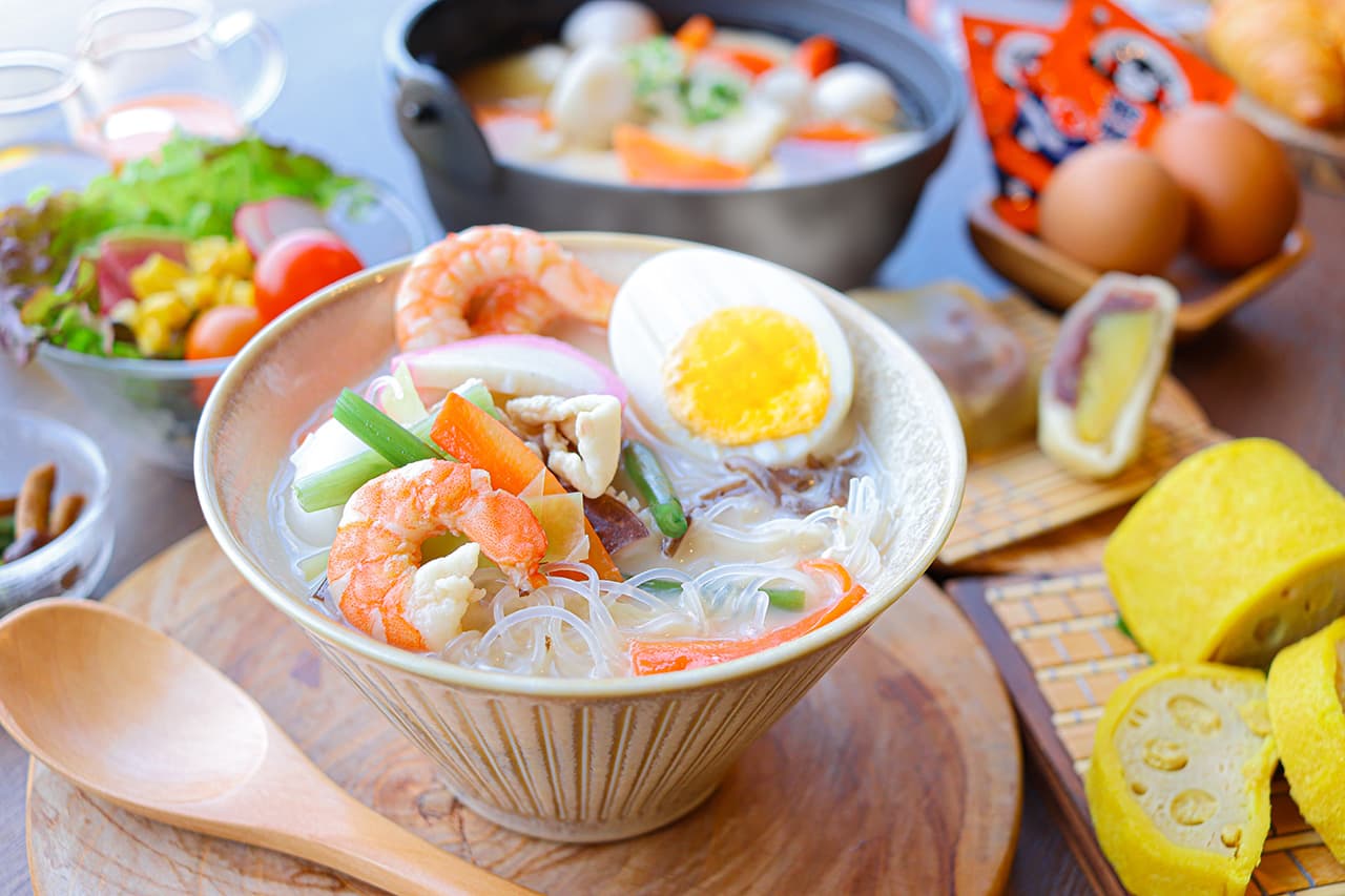 春雨と野菜、豚肉や海鮮をあっさり塩味のスープで仕上げた熊本名物の麺料理です。